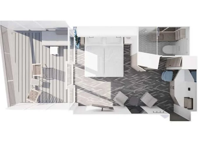 | VKKO - Kajuta s terasou 20 m² + balkón 13 m² so stoličkami a váľandou. 15. paluba. Max 2 osoby. | 5 638 € 5 638 € za osobu | ||